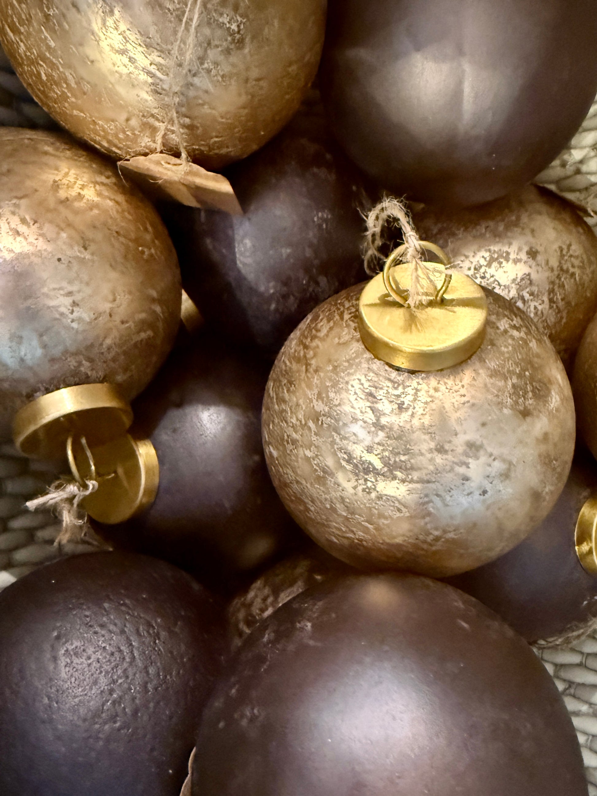 Elevate your holiday décor with the timeless beauty of our 4” Artisan Glass Christmas Ornaments. Each piece is individually crafted and hand-finished, featuring a stunning blend of antique gold and deep bronze tones that capture the glow of candlelight and twinkling trees.