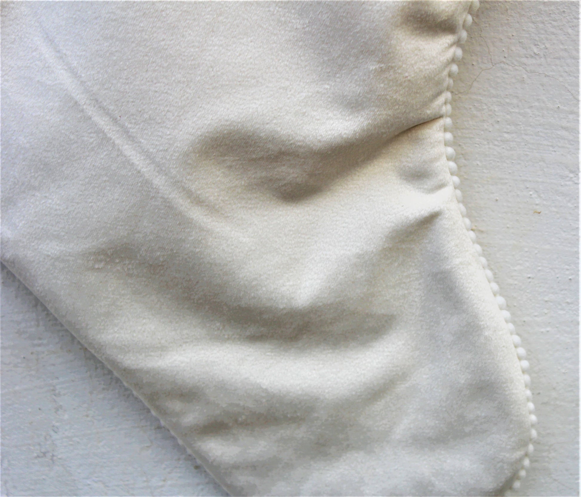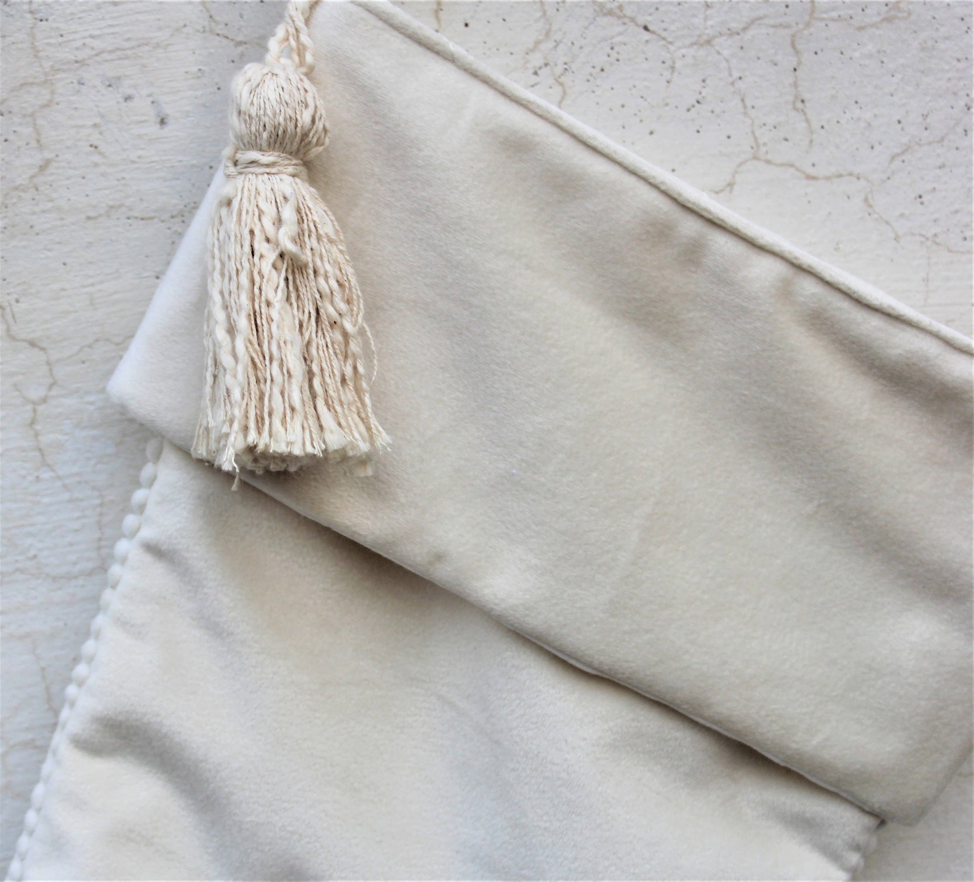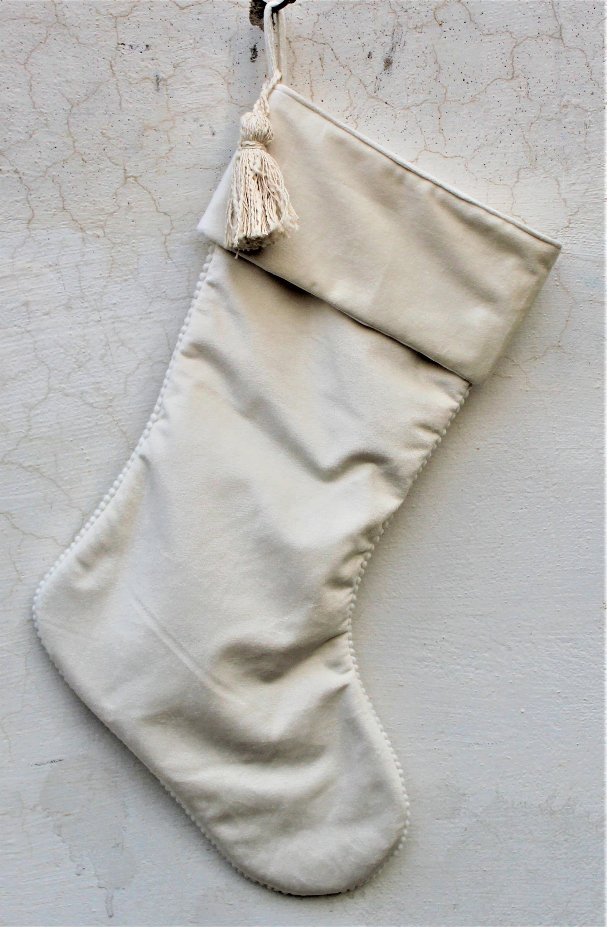These adorable Velvet Christmas stockings are the perfect size. Ivory Velvet with white cotton lining. Ivory color velvet flap on the top and velvet loop for hanging with tassel.Delicate trim detail runs the outer edge of the stocking. These Christmas stockings are sure to brighten your mantle this holiday season. STOCKING MEASUREMENTS: Each stocking measures approximately 20” long, 9” wide at the opening and 13” wide from heel to toe. CARE: Spot cleaning recommended